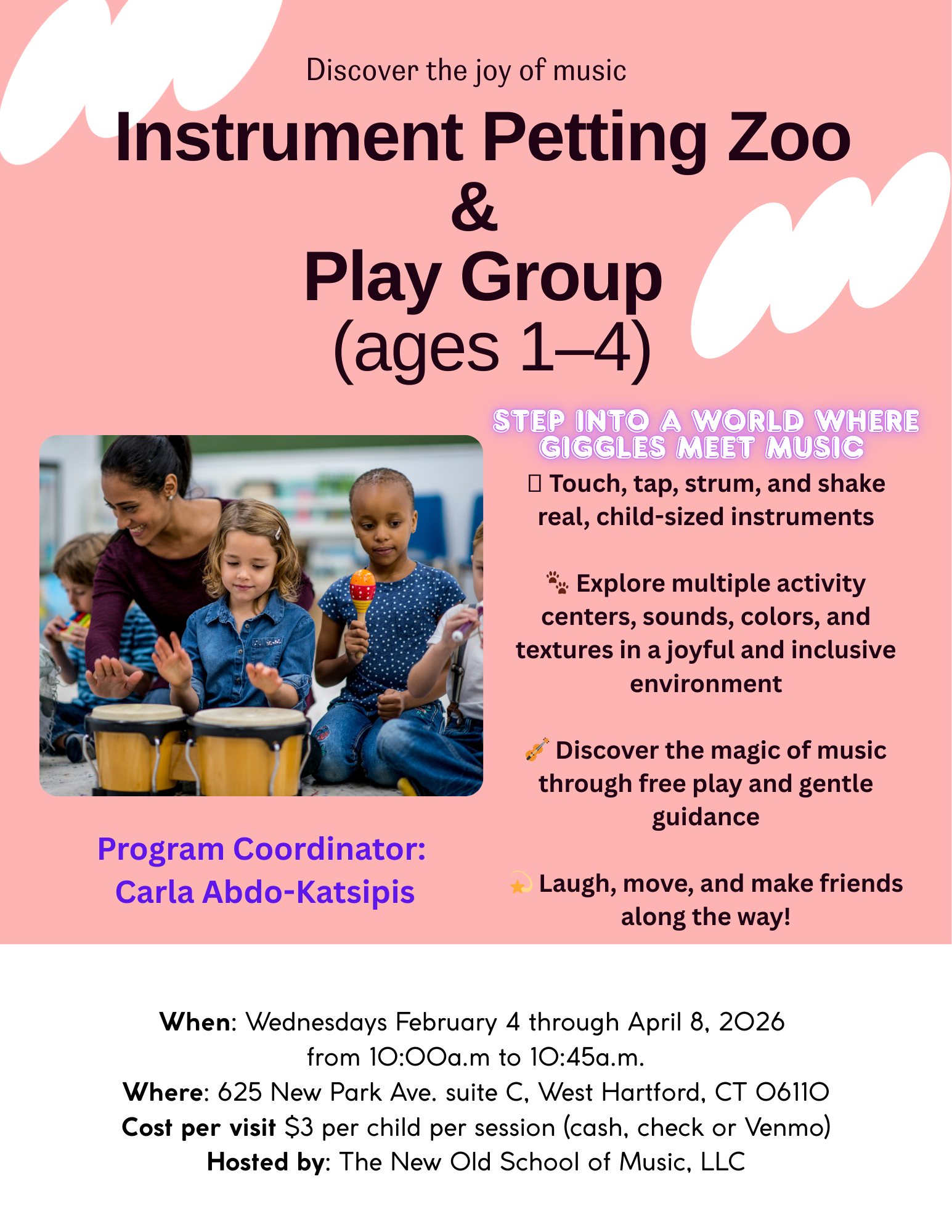 In this program, your growing musician will sing, dance, listen to and play real instruments, shake eggs, beat drums, call & respond, clap, tap, laugh, skip, jump, pretend, learn, sing songs in other languages and listen to a Pete the Cat story at the end of the class. This program is geared towards the development of rhythm, pitch & melody, language skills, motor coordination, interpersonal skills, cultural awareness, and preschool readiness. Research has shown that children who receive early music instruction have increased overall academic achievement. But more importantly, it is just good old-fashioned FUN!